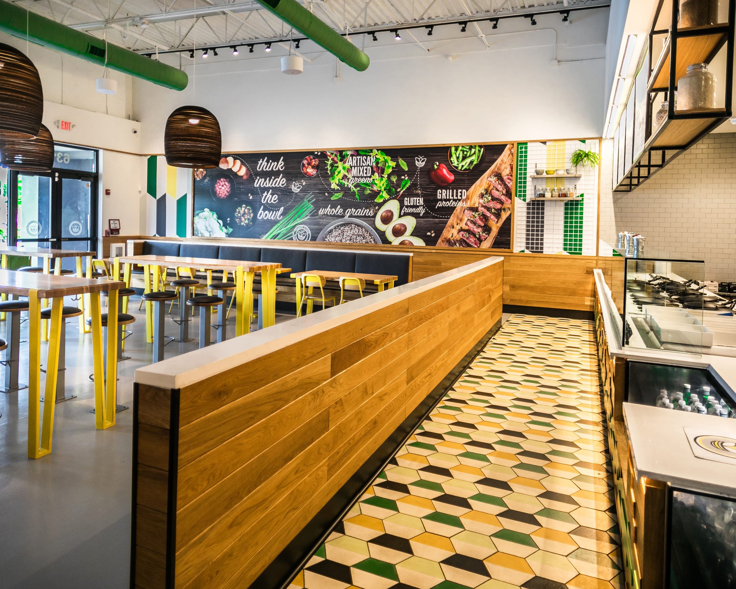 Furniture and finishes inspired by modern architecture and hints of industrial undertones to create a comfortable, of-the-moment feeling. Using a palette with bright gold and emerald tones, dark and light woods, and accented furniture, the space is inviting and accessible.