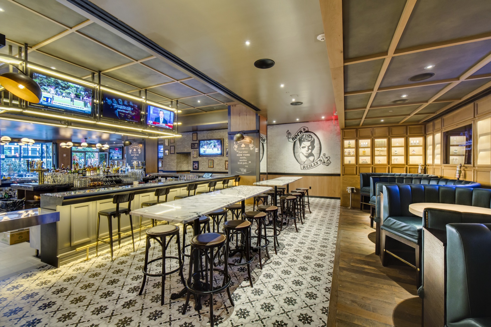Rock and Reilly’s sits on the fifth floor of the Renaissance Hotel in New York City and overlooks the bustling cityscape … ‘It’s got an upscale, vintage English pub look and feel’, Celano says.