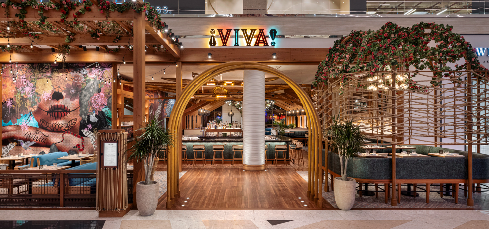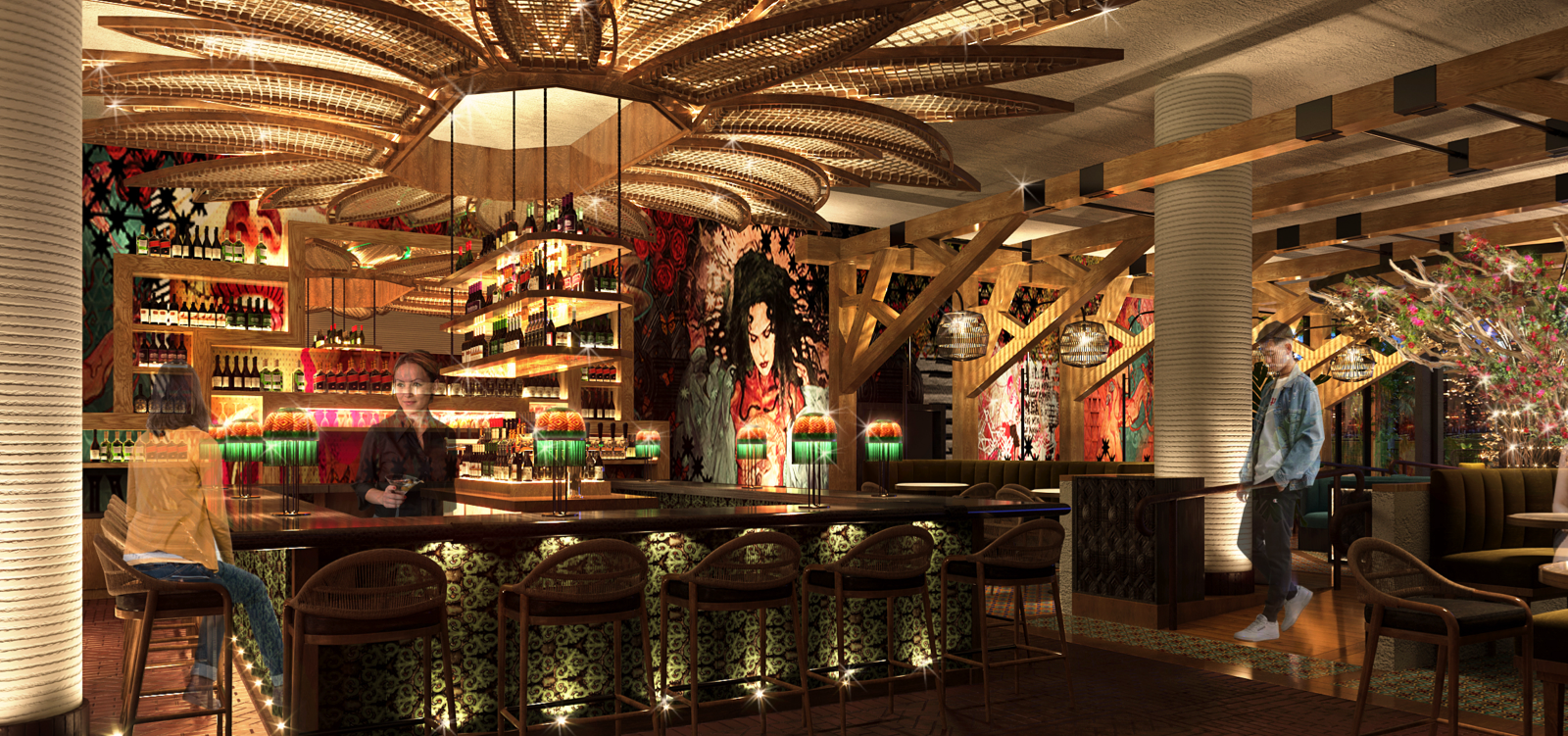 VIVA restaurant creates a playful and inviting atmosphere through sparkling layers of light. Warm rays contrast with shadowed cool areas to evoke feelings of the Tulum sunrise and bring a sense of the outdoors…