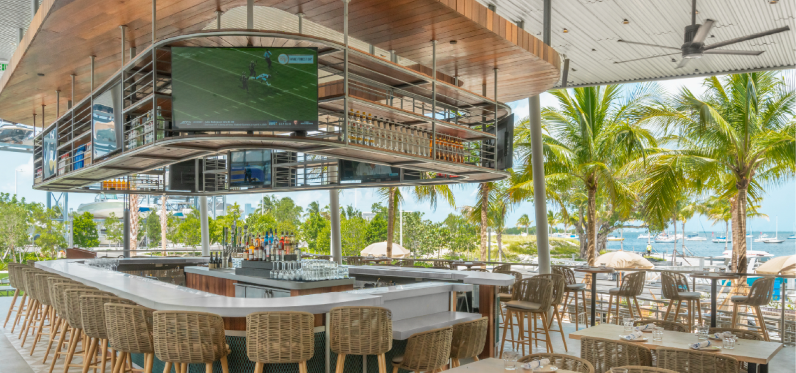 Designed by Celano Design Studio, Bayshore Club is sprawling with 300 seats, and a commanding center bar and dock, where boaters looking to dock and dine are greeted by a postcard-style mural that reads “Greetings from Miami.” For your post-meal hangs, there’s a lawn with cabanas, lounge setups, games, and fire pits, all designed to make you feel as though you were on vacation miles away